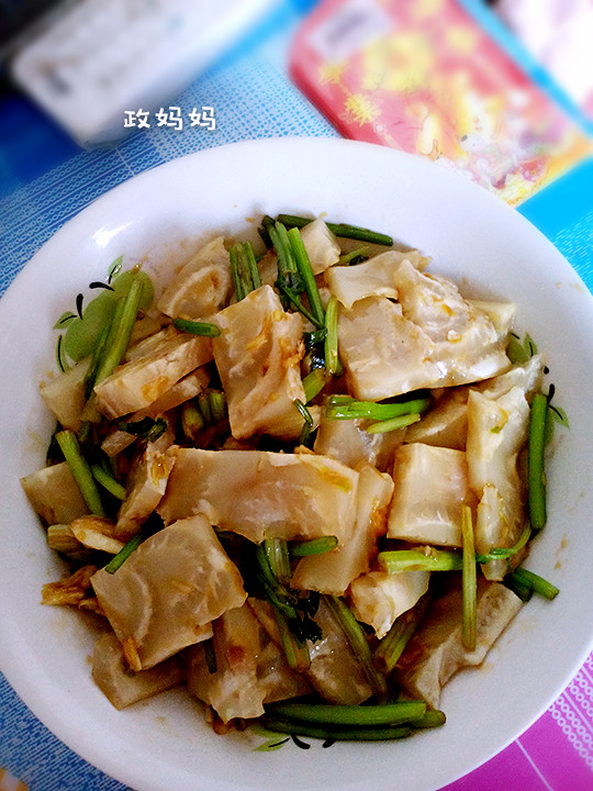 2:把猪皮上的肥油刮净,切成小条,(忘了拍刮肉皮的图了!嘿嘿!就是这步最不好处理了)