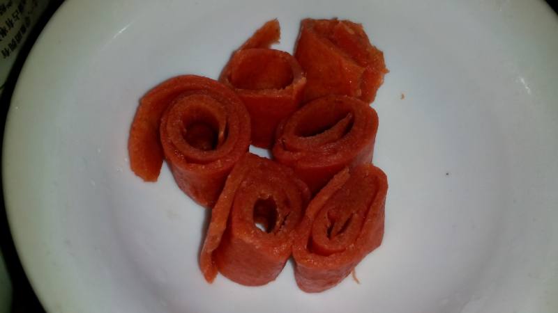 12:用利刀将其切成长短一致的山楂卷;卷得粗一点、切得短一点就是山楂卷;卷得细一点,切得长一点就是果丹皮,总之,都是这么做出来的;有食品包装纸将其包起来或者用保鲜盒装起来,冰箱冷藏保存,随吃随取,可以保存一两个月不变质。