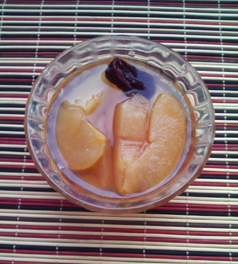 2:切好的苹果、梨、红枣放入锅内,水过材料即可。(喜欢甜点的可以放少许冰糖,最好是土冰糖,因为是懒人,所以选择用电压力锅,选择汤选项即可)
