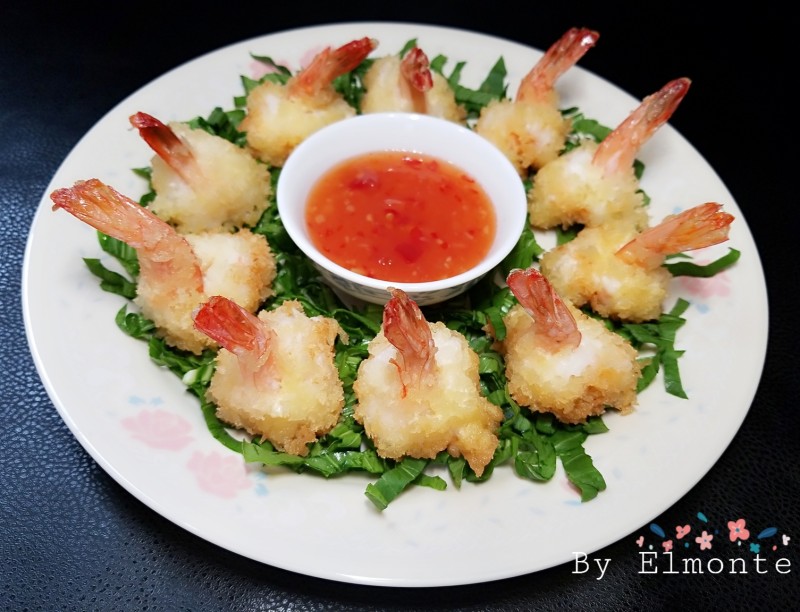 8:可蘸番茄沙司或椒盐粉食用,也可把椒盐粉撒在黄金凤尾虾上食用。