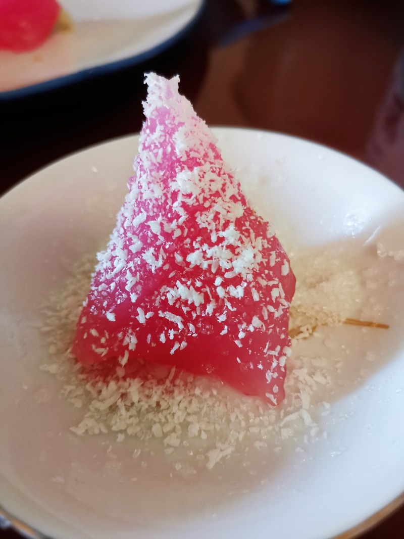 我用的白凉粉包内带有一小包的薄荷粉,不喜欢薄荷味可以忽略不加。一定入冰箱冷藏后,口感最佳。成品不易放置太久,时间长了会慢慢化掉,尽快食用。红火龙果汁入锅煮,量少煮的时间又短,所以不会变色,尽可放心。没有红火龙果汁可替换成等量的清水。