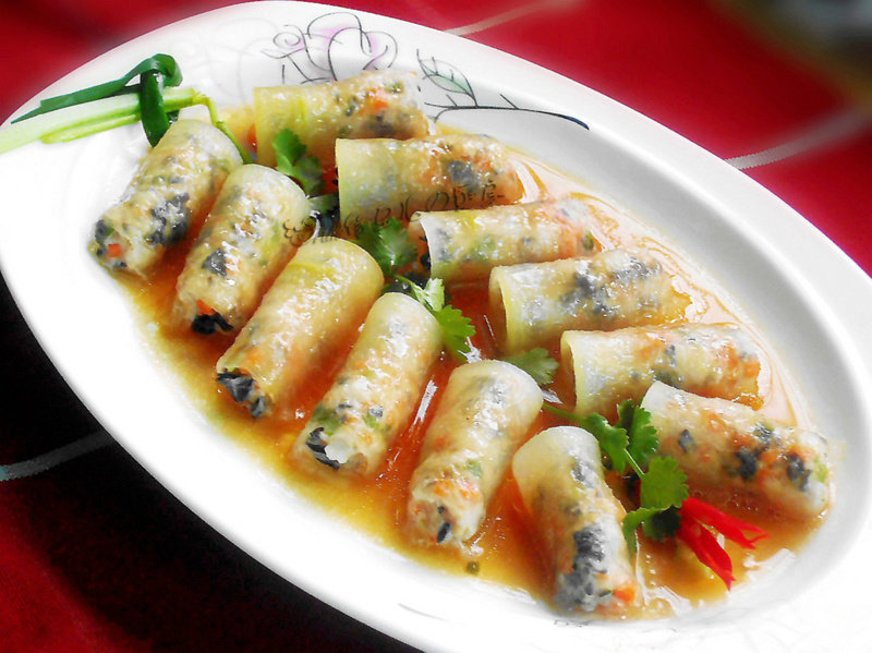 7:都处理好的冬瓜卷还没有蒸制就已经很漂亮了哦。