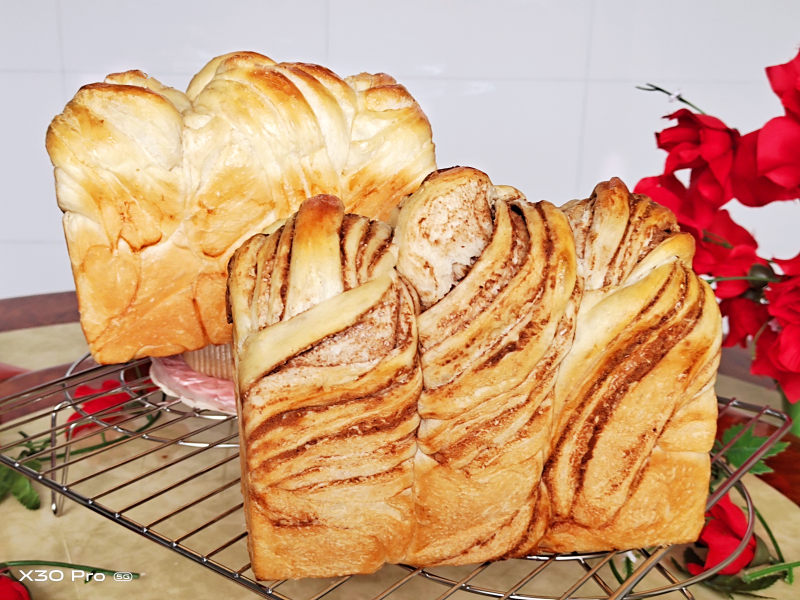 9:剩下的三个面团制作豆沙椰蓉吐司,操作方法相同,只是馅料换成豆沙椰蓉即可,放入吐司盒。