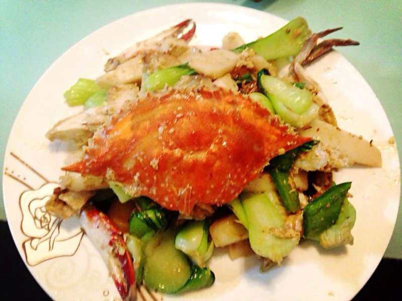 9:翻炒几下后下入刚炸好的螃蟹块一起翻炒;