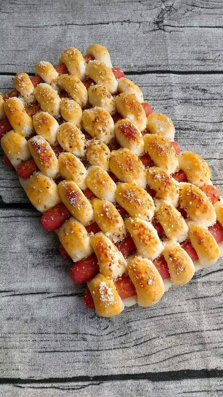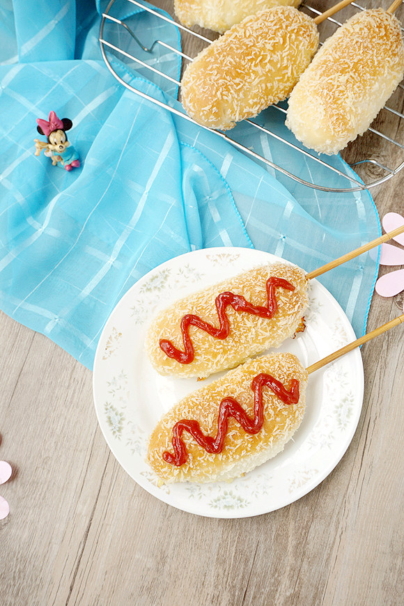 发酵时间需根据温度实际情况酌情调整。热狗肠也可以用平底锅煎至温热后使用。切面包时可以切到底,但不要切断。
