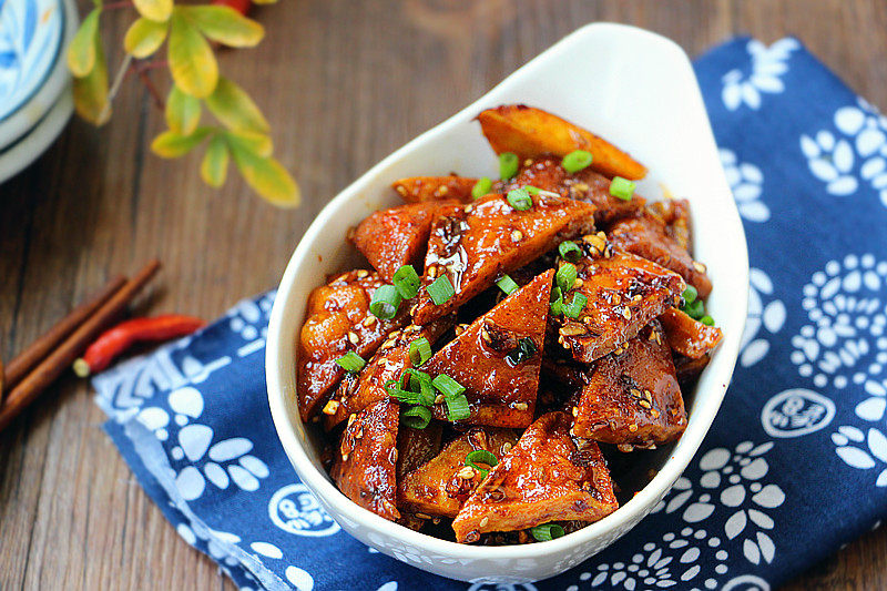 香辣豆腐干独家做法:豆腐干切厚片,先油炸至金黄酥脆,再入锅与干辣椒、花椒、蒜末爆香,加生抽、糖、少许醋调味,最后撒芝麻和葱花。成品外酥里嫩,麻辣鲜香,回味微甜,越嚼越上瘾,好吃到停不下来!