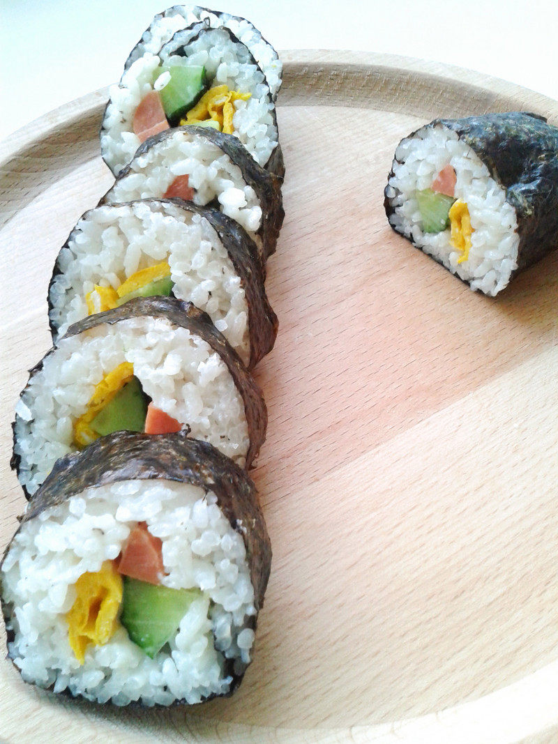 蒸熟的米饭一碗;黄瓜半根;火腿肠半根;鸡蛋一颗;海苔一片;凯撒沙拉酱一袋;