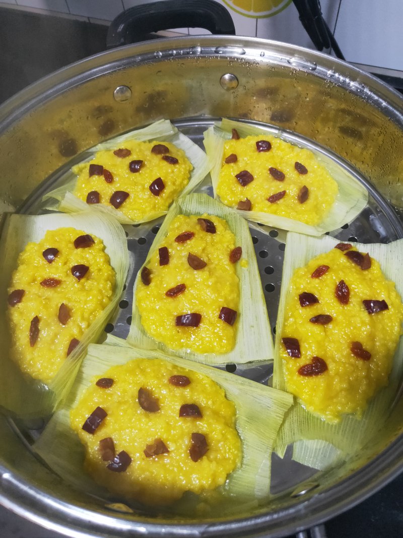 5:把玉米装在叶子上面放入锅中,水开上锅蒸15分钟。
