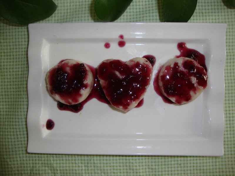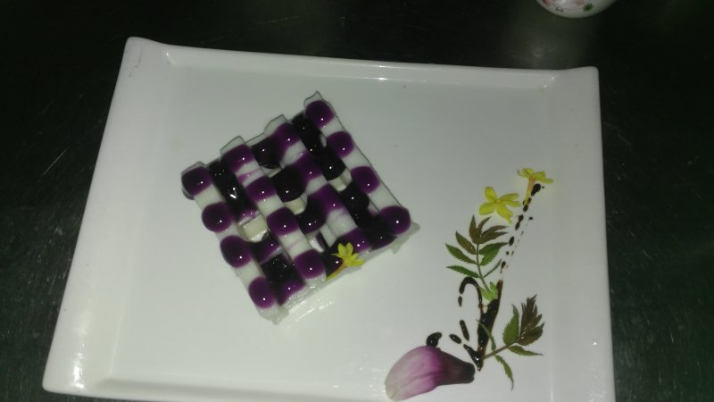 3:3。做好造型入盘,淋上蓝莓酱即可