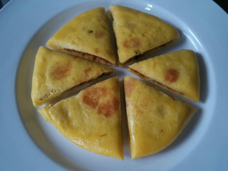 8:翻至另一面进行烙,当饼的厚度又增加了,而且用手指按压时,能很快的弹起,就表明饼已经成熟了,取出装盘。