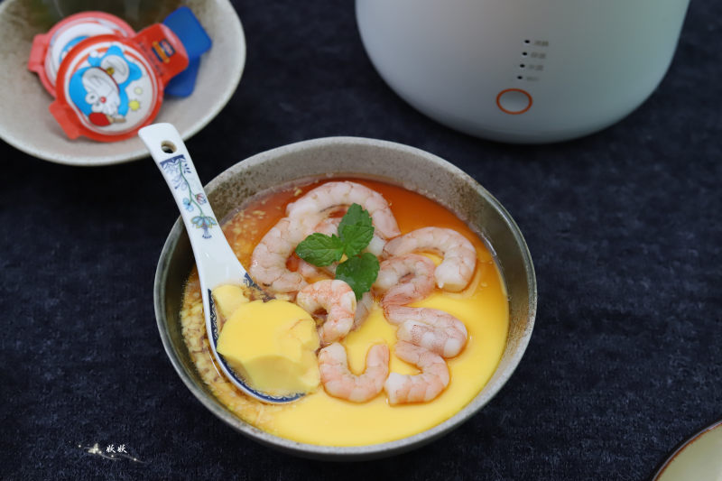 7:鸡蛋大概蒸6到8分钟就能凝固了,这时打开锅盖和盘子,把虾仁上的生粉洗干净后摆在鸡蛋上,盖上盖子和盘子继续加热两分钟。