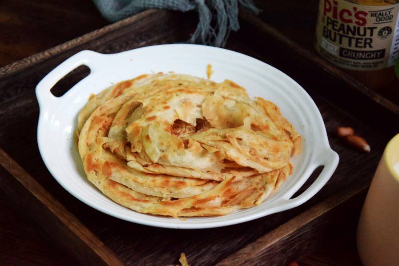5:然后涂上花生酱均匀的抹开,再用轮刀或者菜刀将面片中间划开,保持两头连接