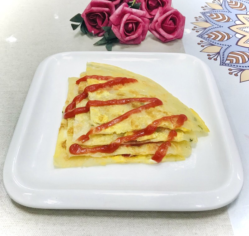 4:再翻过另一面,倒入剩余的鸡蛋液,小火煎。