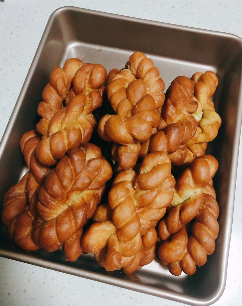 11:做好后摆放到烤盘里松弛5分钟(这只是一小块面团的麻花),照此方法把另一块面团也做好