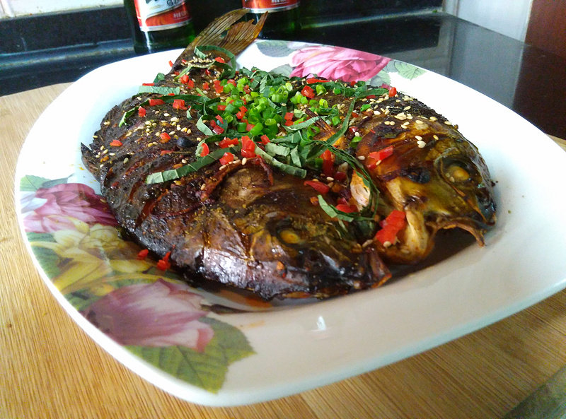 鲤鱼700克;海椒面适量;酱油适量;姜适量;小葱适量;芝麻适量;