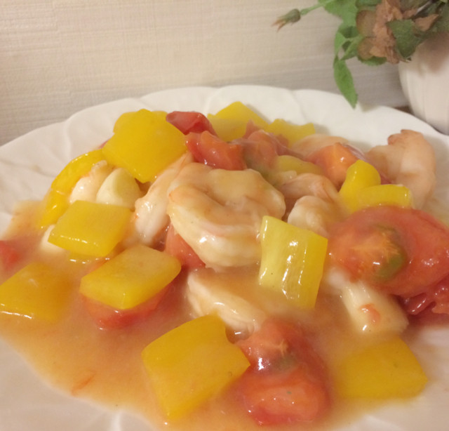 11:放入西红柿、肉椒、虾、大火快炒几下、