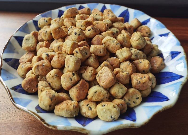 15:将冻硬的面团切成5mm厚的小饼干,放入事先铺好油纸的烤盘内。烤箱预热170度,烤10分钟左右。