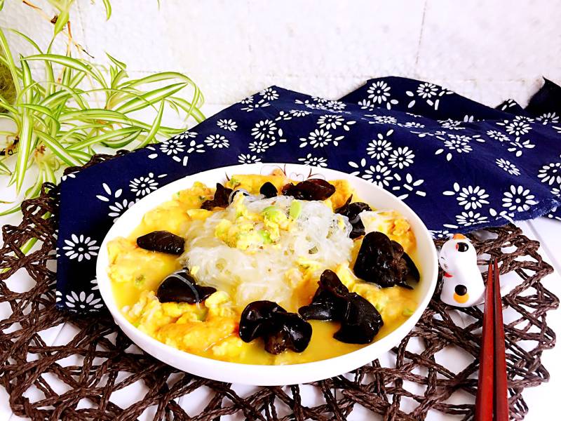 毛豆籽50g;干粉丝30g;泡发黑木耳50g;鸡蛋3个;猪肉泥50g;