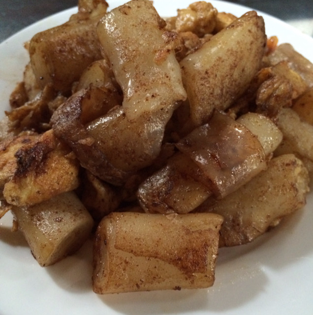 4:凉粉和火腿煎至两面金黄,把调好的汁浇在上面搅拌出锅。