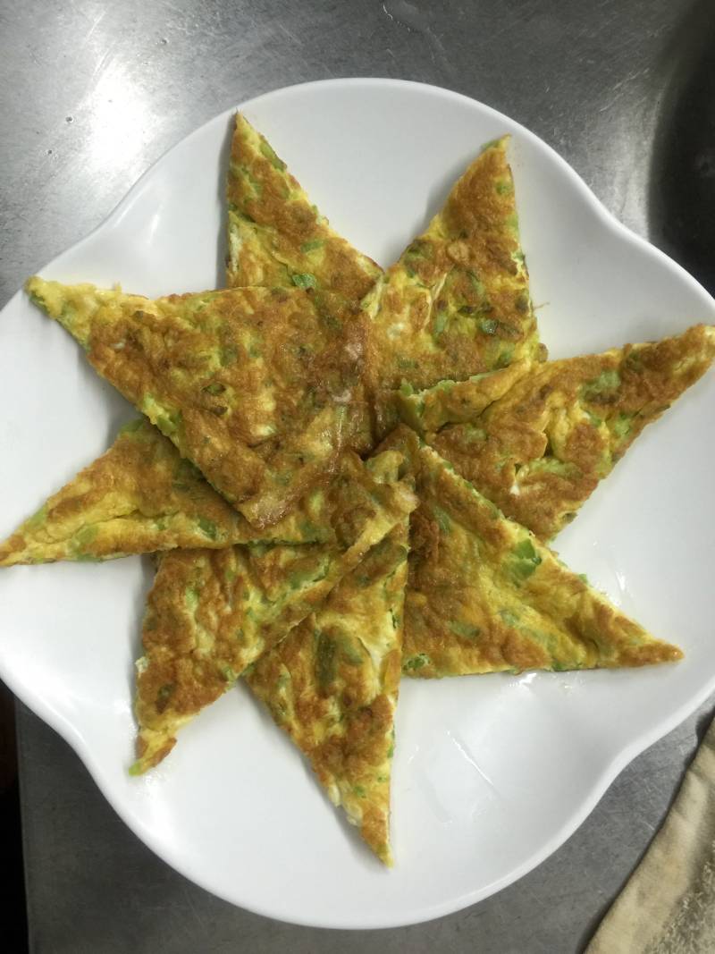 9:全程都是中火哦,过热了倒入一个鸡蛋的量,马上锅在火上转圈,这样鸡蛋饼就是薄薄的圆形了。