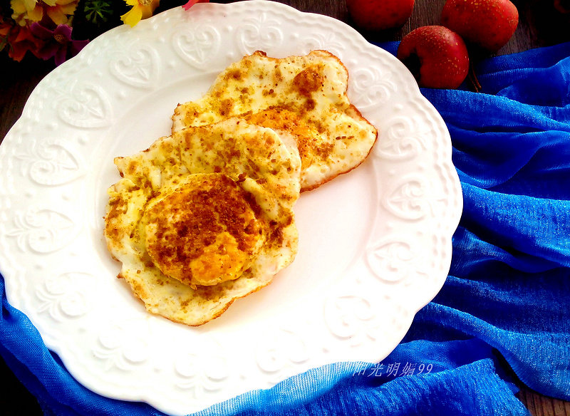 4:在另一面也同样撒上盐,五香粉,孜然粉。两面都入味。(不要撒太多避免过咸)待鸡蛋变略硬就可以出锅了。