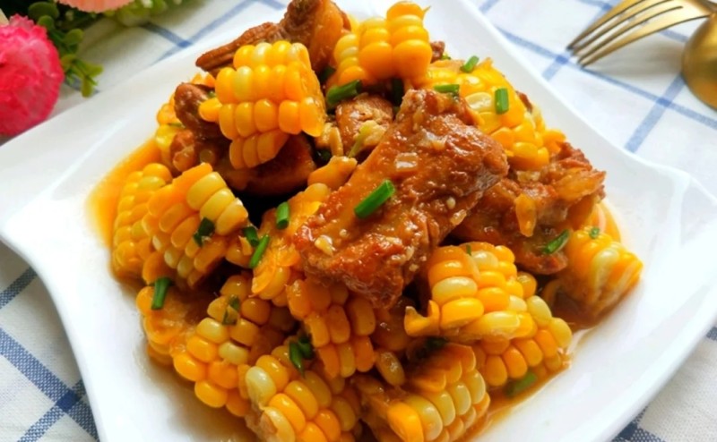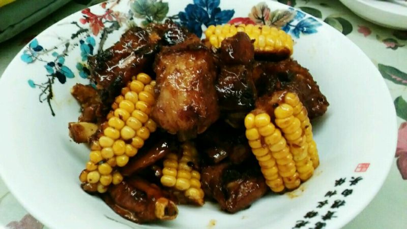 6:下玉米,玉米要浮在肉上,不要翻炒。盖盖烧煮片刻,靠国内热量闷熟玉米。这样玉米能保持它漂亮的颜色。也能沾染肉味。