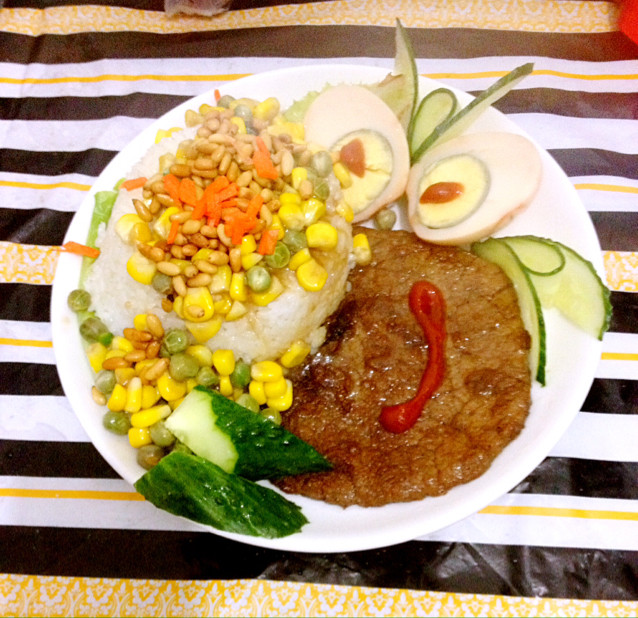 牛排1块;玉米1个;松仁5克;青豆50;鸡蛋1个;黄瓜1支;米饭200克;