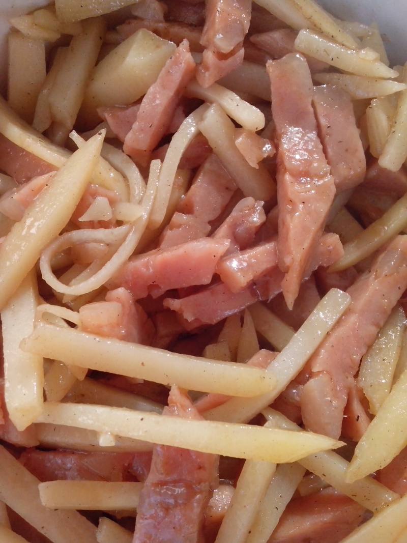 2:起锅放少许的油,放火腿片慢火煎香,煎至闻到香和稍出油后,倒入土豆。