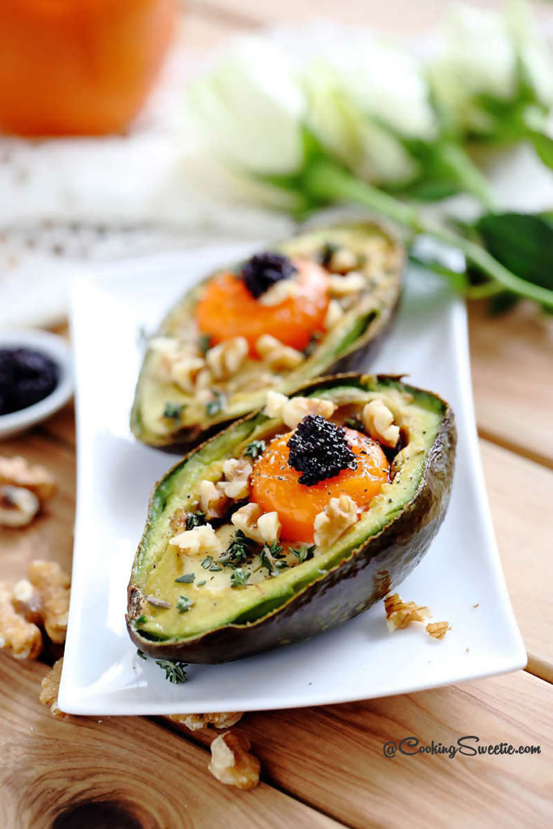 装盘时撒上碎核桃,百里香装饰。可以根据口味加一些意大利香醋调味(这个我觉得很必要,酸酸甜甜的味道恰到好处),当然我还自创加了些鱼子酱,非常的美味哦。温热的牛油果,口感奶香嫩滑,搭配蛋香浓厚的鱼子酱,“Simple,Yummy,Beauty,Healthy”!一个不够的,记得多做一些跟重要的人好好分享哦!(这道菜是纯鬼佬的做法哦,喜欢牛油果味道的亲们应该很惊喜,但不习惯生吃牛油果的亲们,估计有点无法接受这味道。哈哈,这道菜很特别,又非常的好看,友情提示但它也不是适合所有人的味蕾哦!)