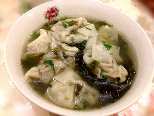 7:把混沌煮好了以后放点香菜,就可以出锅了,也可以少放一点香油在碗里