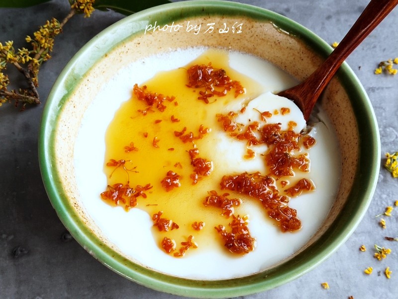 8:拿出来去掉保鲜膜,挖一勺桂花酱放上。