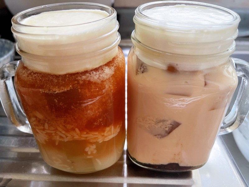 10:材料准备好之后,就开始愉快的组装奶茶吧分量都可以按个人喜好调整。芝士奶盖酒酿桂花冻:放入100克桂花冻,2勺酒酿,3匙柠檬糖浆,倒入原味的桂花绿茶,再放一层厚厚的芝士奶盖,完成。芝士奶盖桂花冻黑糖珍珠奶茶:放入100克桂花冻,30克黑糖珍珠,3匙柠檬糖浆,倒入奶茶,再放上厚厚的芝士奶盖,完成。