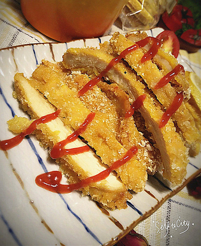 8:捞出后放在吸油纸上将多余油吸掉,然后把剪成条状趁热加入蕃茄酱,这样鸡排做好了。