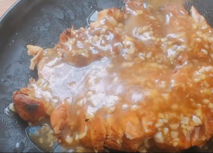 6:锅里热油爆香蒜姜末,加入适量水煮开后加入盐,酱油,蚝油,糖,醋,水淀粉煮至浓稠即可。