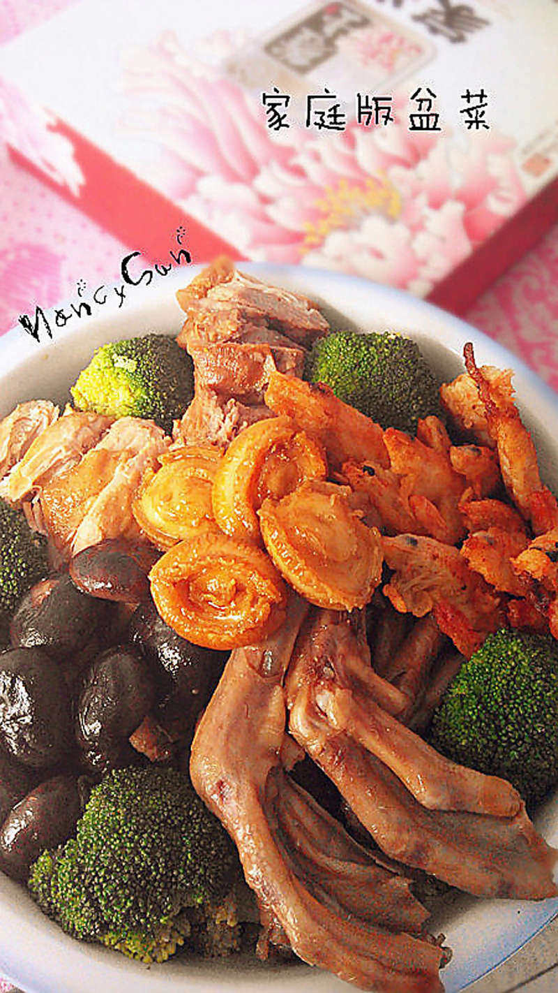 9:最后装盆:最下面放萝卜,然后是枝竹,然后是用西兰花装饰并将猪肉、鸡肉切块,虾、香菇、鲍鱼、鸭掌分别装入。最后在吃的时候淋入汤汁连盆烧上个十几分钟即可。