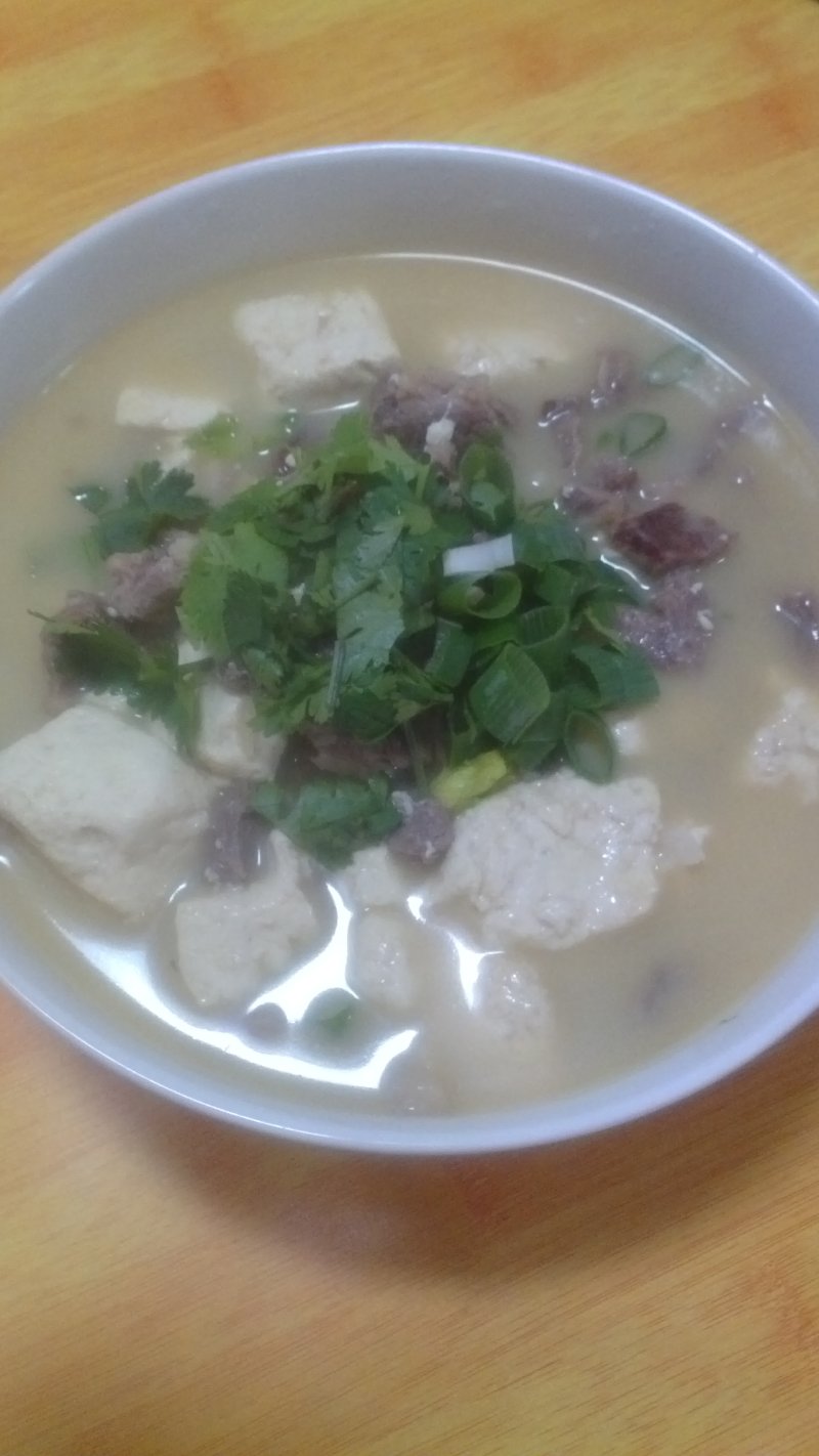 一定要用新鲜的卤水豆腐,不然汤不变白,味道也不好。牛肉也要嫩牛肉,不然半天也煮不熟。今天做的突然,家里没苏子了就沒做延边这里喝牛肉汤专门用的辣酱,只能用辣椒油了。