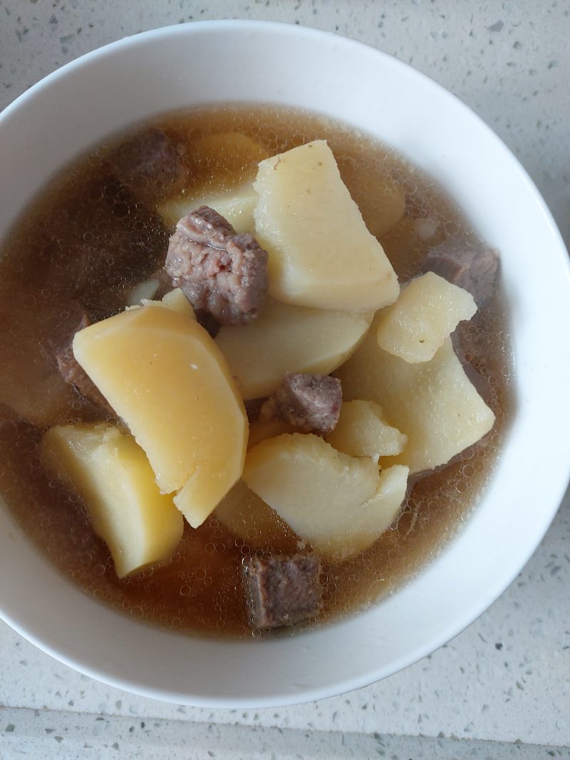 5:加水,蒜片,胡椒粉,一匙海鲜酱油。大火煮开至汤色变白,转中火15分钟后再转小火20分钟,至牛肉熟透。