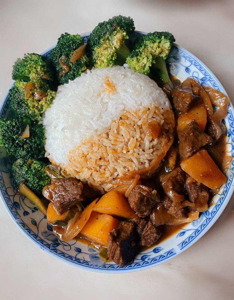 1:牛肉切成块,用盐、料酒、生姜、生抽、黑胡椒粉和植物油腌制30分钟。