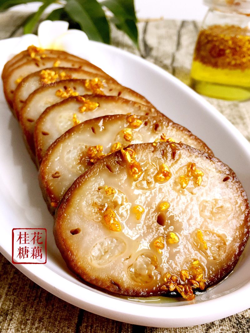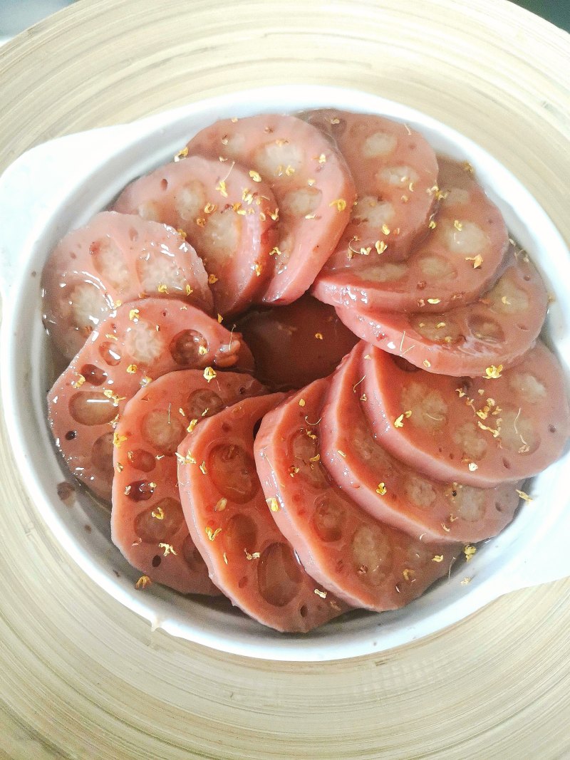 5:煮好后等藕凉透后切片,摆好后浇上桂花蜜,就可以开吃了,好吃不腻而且好消化。
