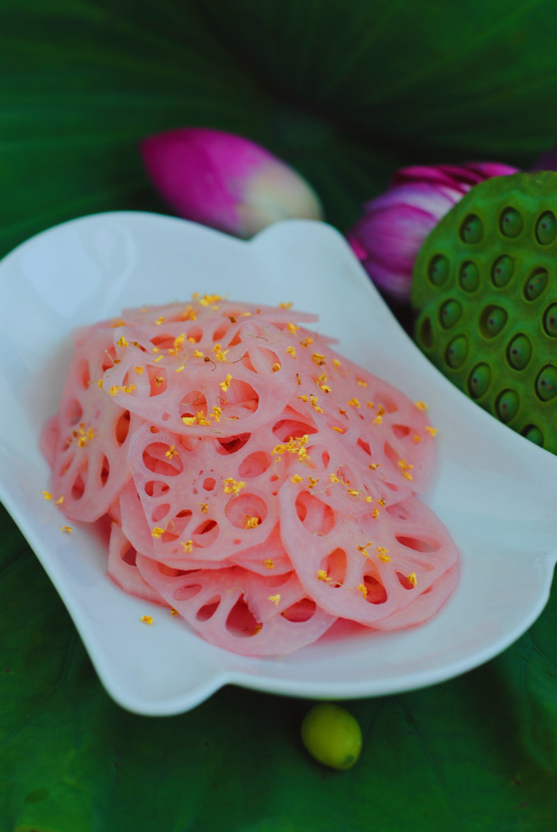 6:取出冷藏好的藕片装盘后淋上蜂蜜,撒上干桂花即可。酸甜清脆的桂花胭脂藕片就做好了。