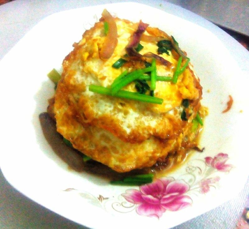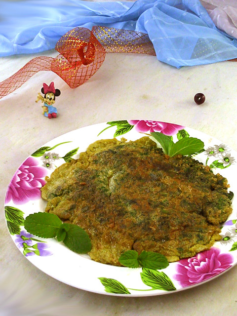 7:倒入打好的薄荷鸡蛋,摊成饼状