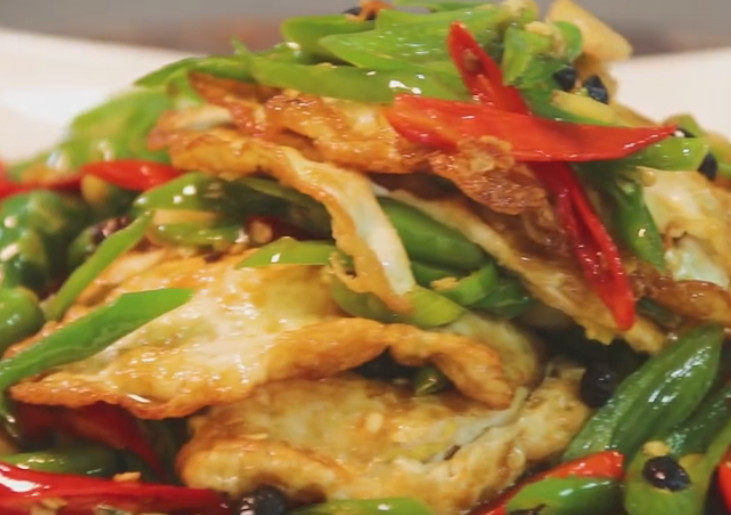 5:青椒炒软后倒入荷包蛋,加点酱油,水翻炒均匀。