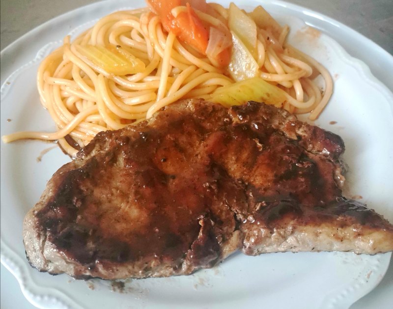 7:牛排放锅中煎熟,我们不喜欢吃生,所以煎大概五六分钟,九分熟左右。