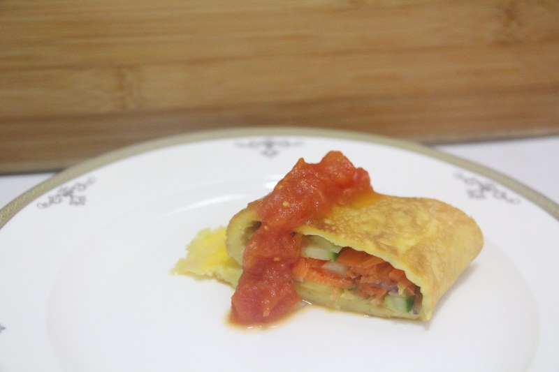 7:番茄粒放入锅中,加入白糖,小火煮成番茄汁。浇在蛋卷上。