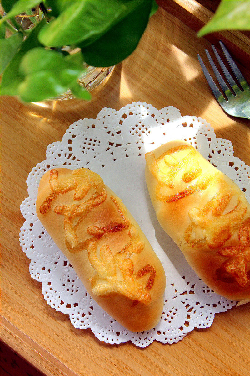 9:9,发酵至二倍大后,在表面均匀的刷上一层蛋液,间隔铺上芝士条,挤上沙拉酱。