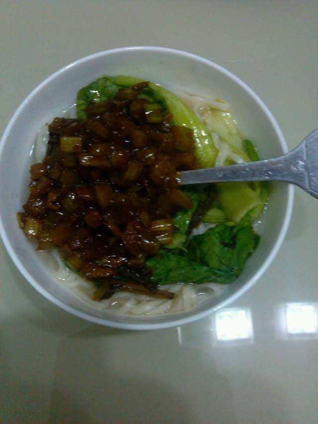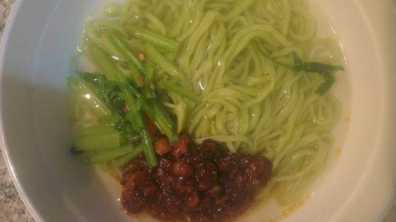 3:煮锅里清水下挂面,爱动手的朋友可以做手擀面,会更好吃,小白菜焯水,放在煮熟的面条上,再放上炸酱,大功告成!