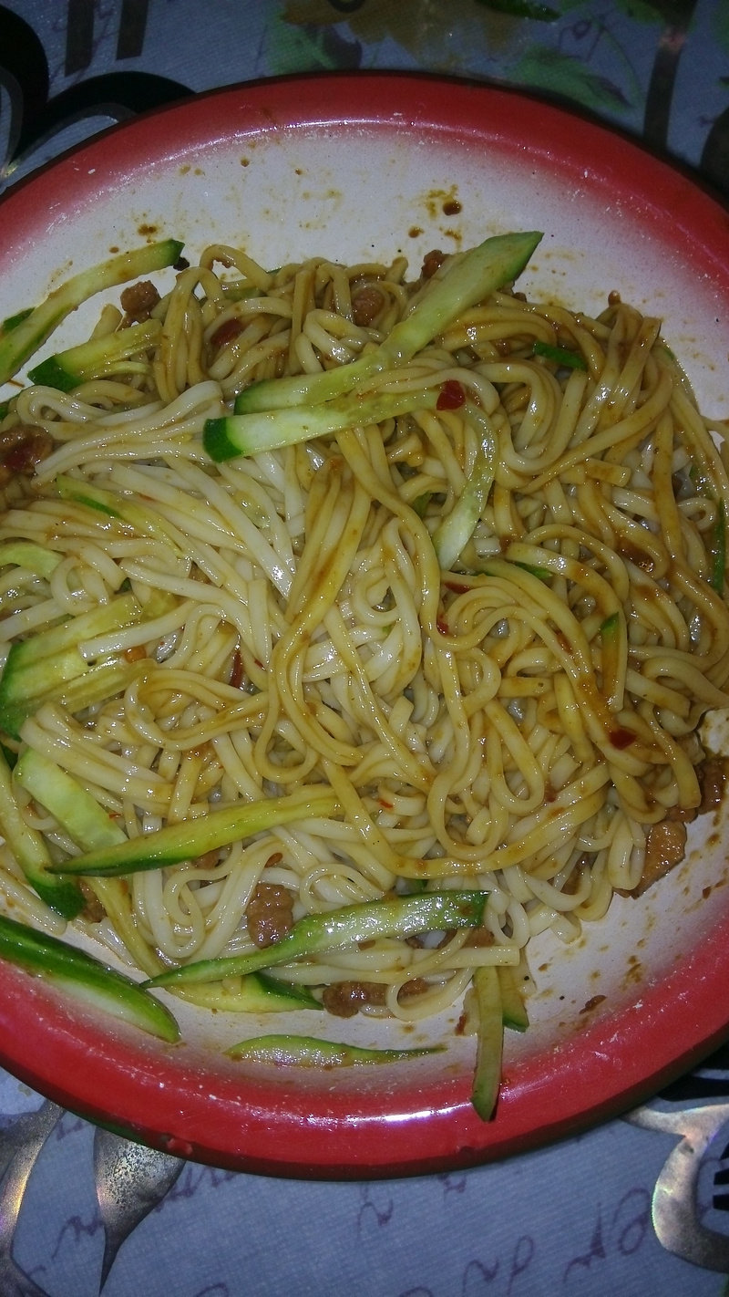 11:家里就剩下黄瓜了,码在面条上然后加上熬好的酱,搅拌,开吃吧!!