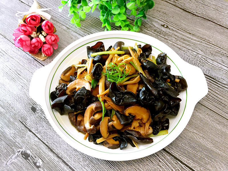 6:锅内热油,放入香菇和黑木耳翻炒2分钟,调入少许盐先。
