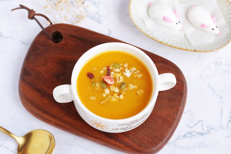 南瓜没有去皮,所以打出来的颜色会有些暗沉,介意的小伙伴可以去皮打成米糊。