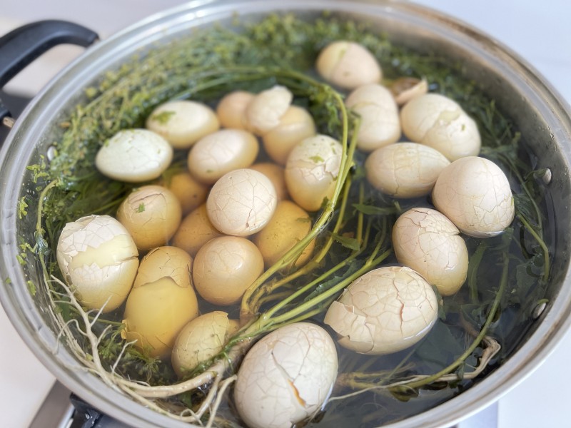 5:砂锅里的汤被熬成绿色,浸泡2个小时后捞出,鸡蛋壳上也会染上绿色。剥掉蛋壳就可以享受清香美味的荠菜煮鸡蛋了,吃完鸡蛋还可以喝点荠菜汤。如果煮的鸡蛋当天吃不完,也可以放在荠菜汤中浸泡1晚,第二天吃起来更入味儿,剥壳后还能看到鸡蛋上有淡绿色的碎纹。